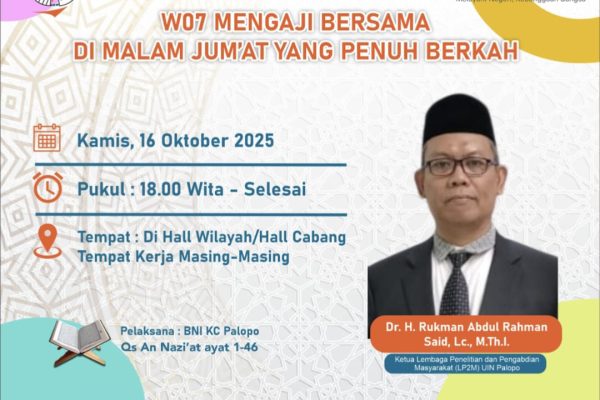 Palopo, (16/10/2025) – Dr. H. Rukman AR Said, Lc., M.Th.I., Dosen dari Program Studi Ilmu Al-Qur’an dan Tafsir UIN Palopo, hadir sebagai narasumber utama dalam kegiatan keagamaan yang diselenggarakan oleh Bank Negara Indonesia (BNI) Kantor Cabang Palopo. Sebagai bagian dari pelaksanaan Tri Dharma Perguruan Tinggi, khususnya pengabdian kepada masyarakat. Acara bertajuk “Mengaji Bersama di Malam…