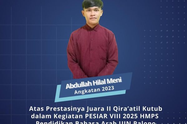PALOPO (14/12/2025) – Abdullah Hilal, Mahasiswa Program Studi Ilmu Al-Qur’an dan Tafsir UIN Palopo sukses meraih Juara II dalam kompetisi Lomba Qiraatul Kutub Tingkat Nasional. Prestasi bergengsi ini diperoleh Hilal dalam kegiatan PESIAR VIII (Pentas Seni Arab) yang diselenggarakan secara akbar oleh Himpunan Mahasiswa Program Studi (HMPS) Pendidikan Bahasa Arab UIN Palopo. Dengan cakupan peserta…