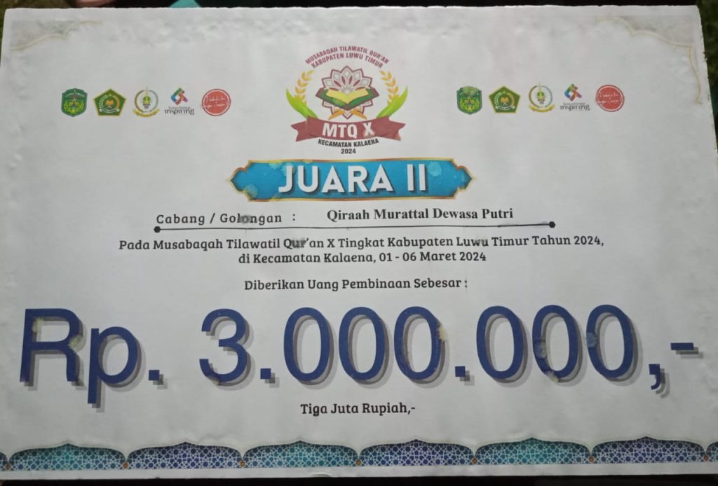 Prestasi ini diraih setelah melalui persaingan ketat selama enam hari penuh, dari tanggal 1 hingga 6 Maret 2024. Melalui cabang Qiraat Murottal Dewasa Putri, Riskiya menunjukkan kualitas lantunan tartil (murottal) Al-Qur’an yang indah dan sesuai kaidah tajwid, berhasil mengamankan posisi terhormat di tingkat kompetisi tersebut dan berhak atas uang pembinaan.